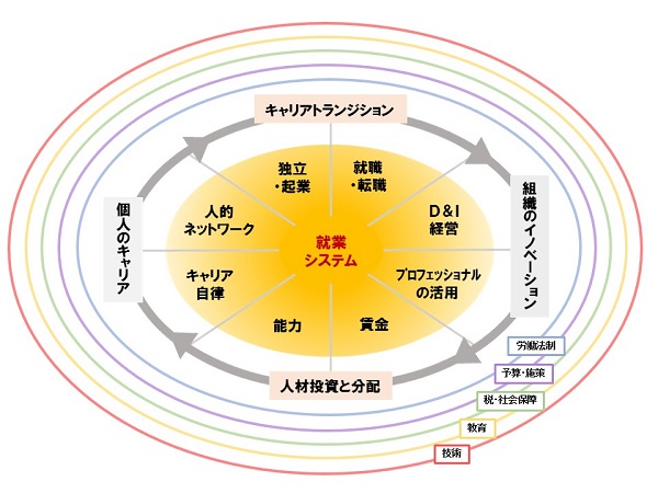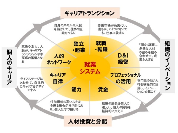 個人は「キャリア自律」と自らの「人的ネットワーク」をもとに、「独立・起業」や「就職・転職」というキャリアトランジションを通じて組織に参画する。組織は「ダイバーシティ&インクルージョン(D&I)経営」と「プロフェッショナルの活用」により、多様な人材を活用することでイノベーションを持続的に生み出す。そのイノベーションを生み出す過程で、組織は「能力」の開発機会と「賃金」を人材に投資し、対価として分配する。個人はまた、こうして得た能力や収入を支えとして、次の挑戦に踏み出す。