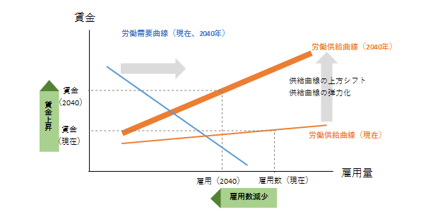 一方、2040年はどうだろうか。引き続き外国人材に対する高い需要があり、労働需要曲線は現在と同じ傾きとする。一方、外国人材の労働供給曲線は、外国人材の国際的な獲得競争が激しくなること、日本とほかのアジア諸国の経済格差が縮小することにより、①上方向にシフトし(同じ賃金に対して供給量が減る)、②より傾きがきつくなる(賃金水準によって労働供給量が変動しにくくなる)と考えられる。