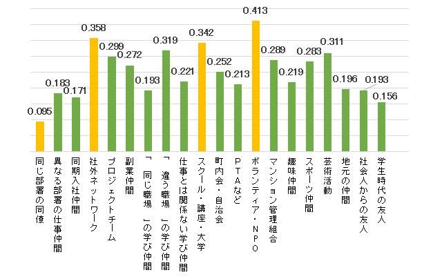 人的ネットワークの重要性は、リクルートワークス研究所の分析でも明らかになっている(図表3)。ふだん、「同じ部署の同僚」だけとつき合っている人よりも、「社外ネットワーク」「スクール・講座・大学」「ボランティア・NPO」など、社外のコミュニティにも所属している人のほうが、これからの人生やキャリアに対して、明るく、前向きなイメージをもっているのである。