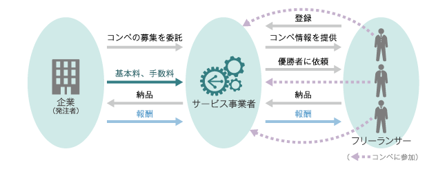 多くの人材に業務を委託できるサービスで、企業はより速く、高レベルで低コストな労働力を確保できる。ボリュームの大きい単純作業を扱うマイクロタスク型と、プロジェクトごとに作品を募って委託先を決めるコンペ型がある。