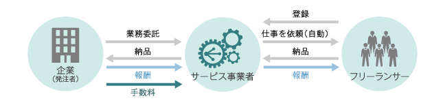 企業(発注者)が業務委託費用総額の5~40%程度の手数料をサービス事業者に支払う。手数料は難易度や業務内容により異なる。